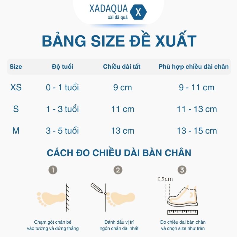 Tất được đóng gói gọn gàng trong túi zip 5 đôi, dễ dàng sử dụng và bảo quản. Sản phẩm có sẵn các kích cỡ XS (0-1 tuổi), S (1-3 tuổi), và M (3-5 tuổi), phù hợp cho mọi bé sơ sinh.